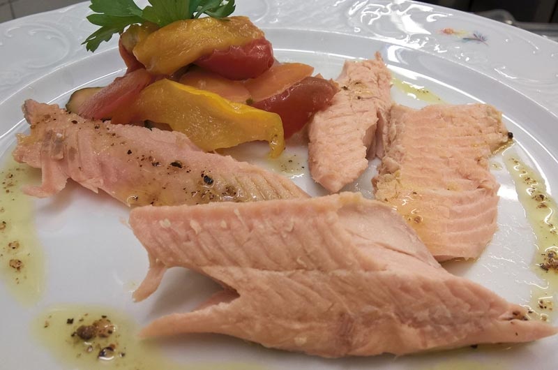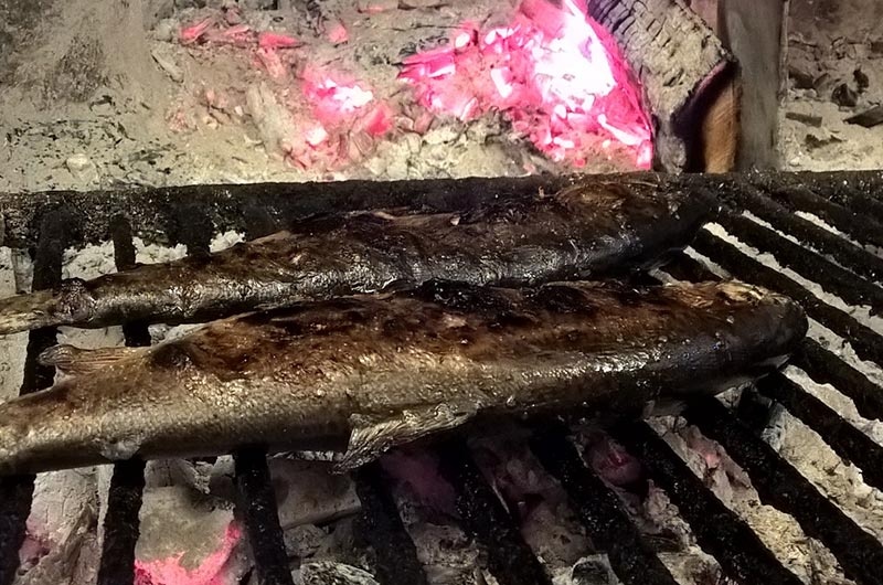 die das Gasthaus berühmt machte, ist die gegrillte Forelle auf Holzkohle, die wir einmal im Jahr in der alten Methode der Kimbern produzieren. Pasta, Kuchen, Konfitüren, Marmeladen, Äpfel - Senf sind alle hausgemacht.